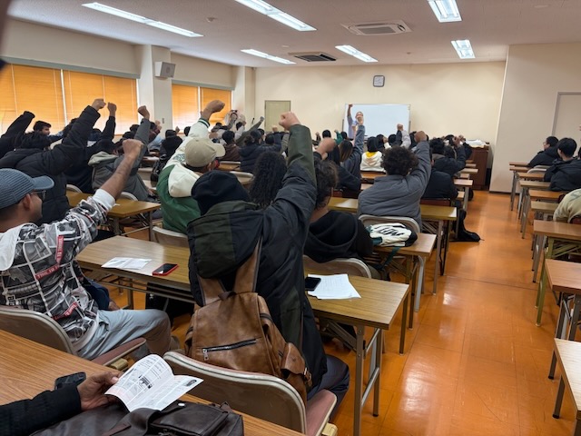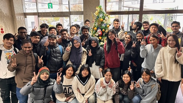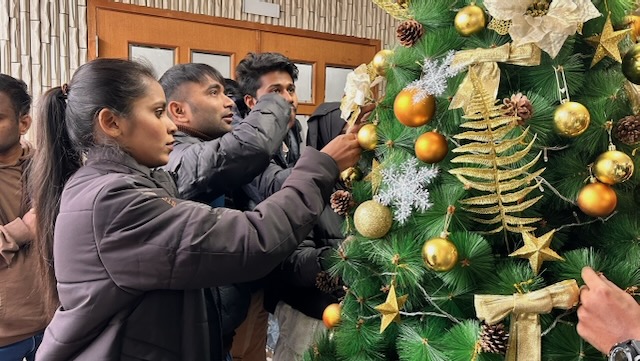 12月4日、留学生たちが学校ロビーにクリスマスツリーの飾り付けをしてくれました。オーナメントを手に、自然と笑顔が広がる温かな時間となりました。また、日本語能力試験の受験を控えた学生たちが教室に集まり、12月7日の受験に向けて気持ちをひとつに。「がんばろう!」という声とともに、冬の訪れと挑戦への決意を感じる一日でした。